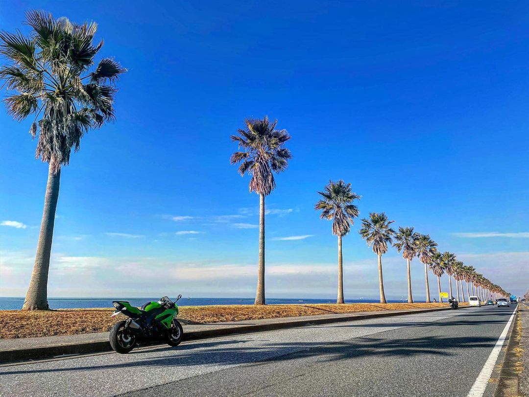 東京湾アクアライン木更津金田インターチェンジから10分程度海沿いに向かっていった先に、袖ケ浦海浜公園へと続く1㎞ちょっとの市道が千葉フォルニアです。青い海と青い空、立ち並ぶヤシの木はまさにカリフォルニアを彷彿とさせ、南国気分を味わいながら愛車で風を切って走るのはツーリング好きには堪りません。また、背景が画になることから人気のインスタ映えスポットとなっています。アクアラインを通れば都心からのアクセスが良好なのも魅力的です。そのため、休日は県外からも多くの車やバイクのツーリング客で賑わっています。
